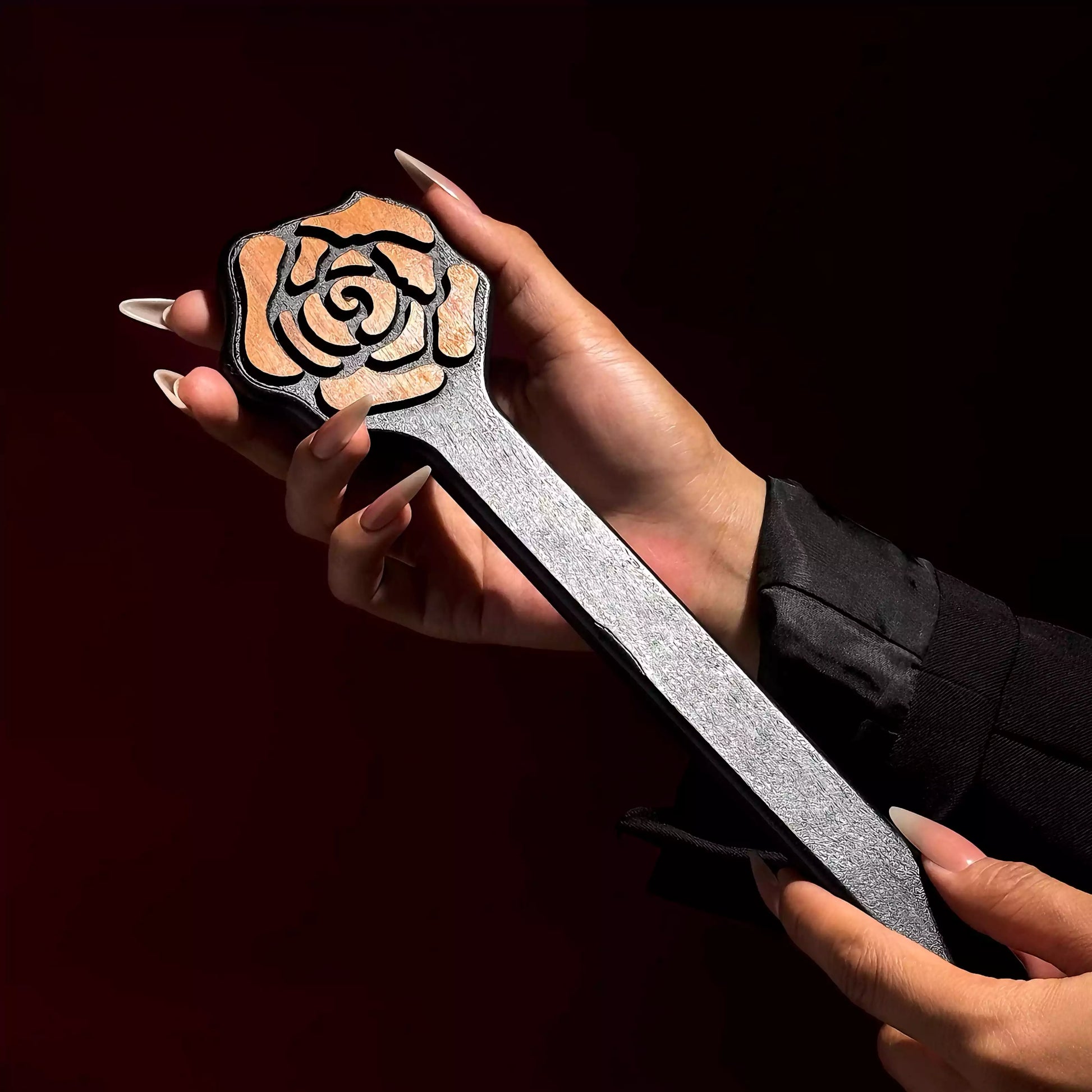 This solid wood discipline ruler paddle combines an ebony handle with a red pear wood striking face featuring a rose motif. Crafted from full solid wood, it delivers clear, direct feedback with stable handling and a balanced feel.